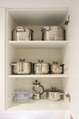 Мебель светлых тонов и большое количество шкафов, постельное бельё отличного качества.