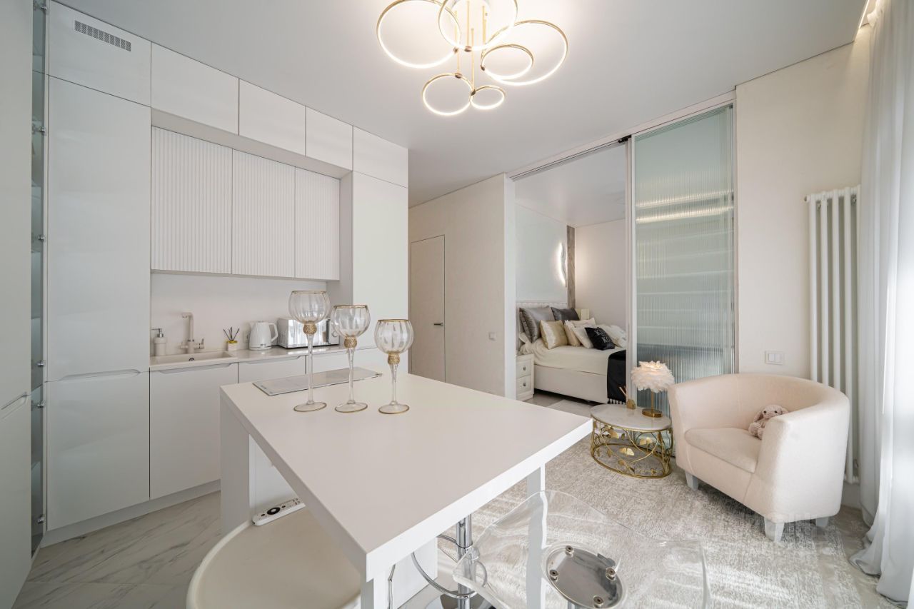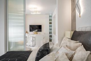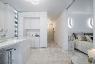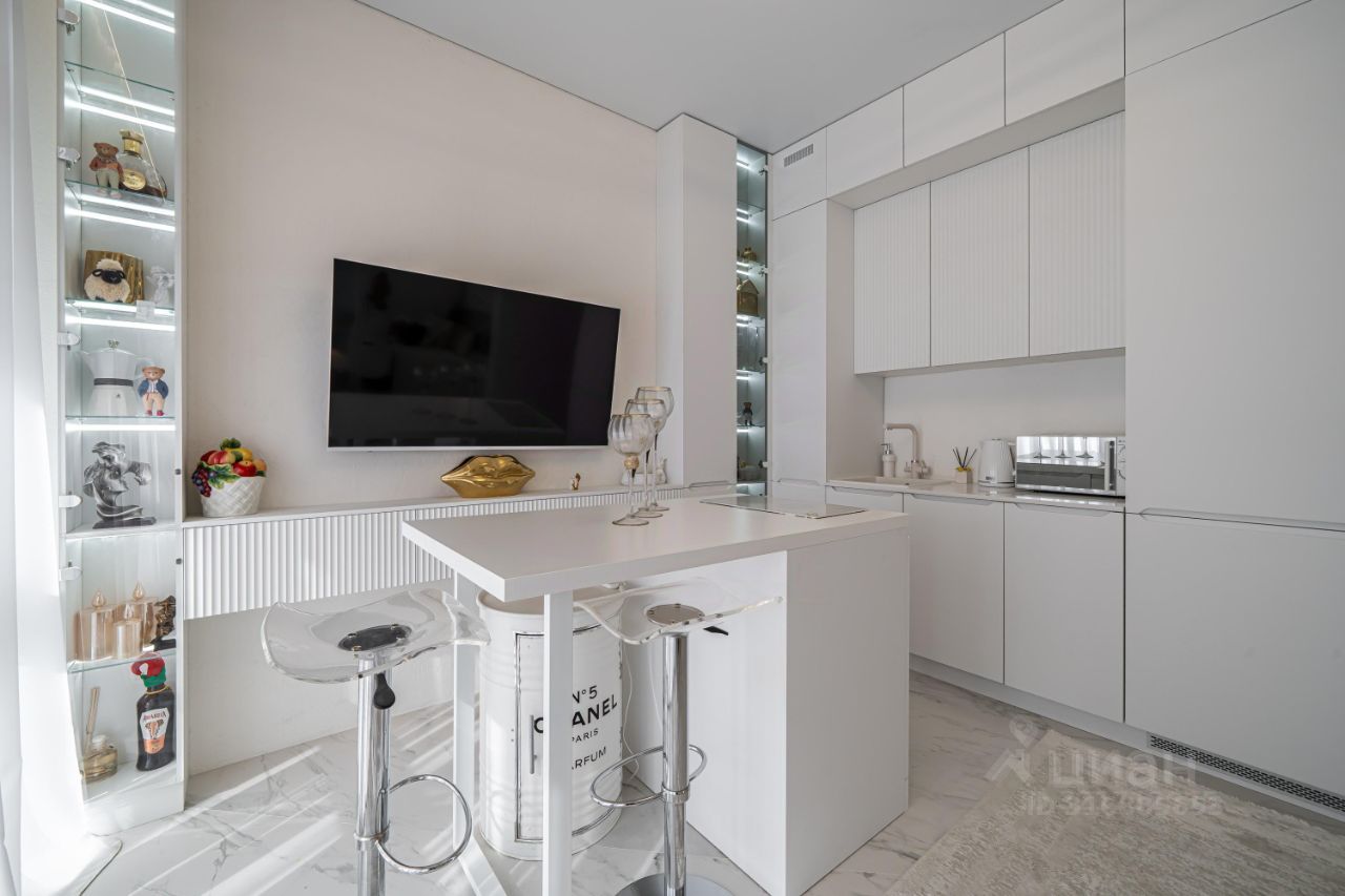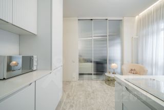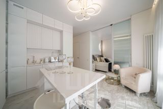 Квартира обладает высокими потолками и панорамными окнами. Из кухни и спальни выходы на большой балкон.