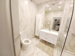 Квартира меблирована и оборудована всей необходимой техникой. Белый кухонный гарнитур с посудомоечной машиной и всей остальной техникой, встроенная стиральная машина, холодильник, ТВ и т.д. Большая двуспальная кровать, диван, круглый стеклянный стол, стулья - всё удобное и качественное.