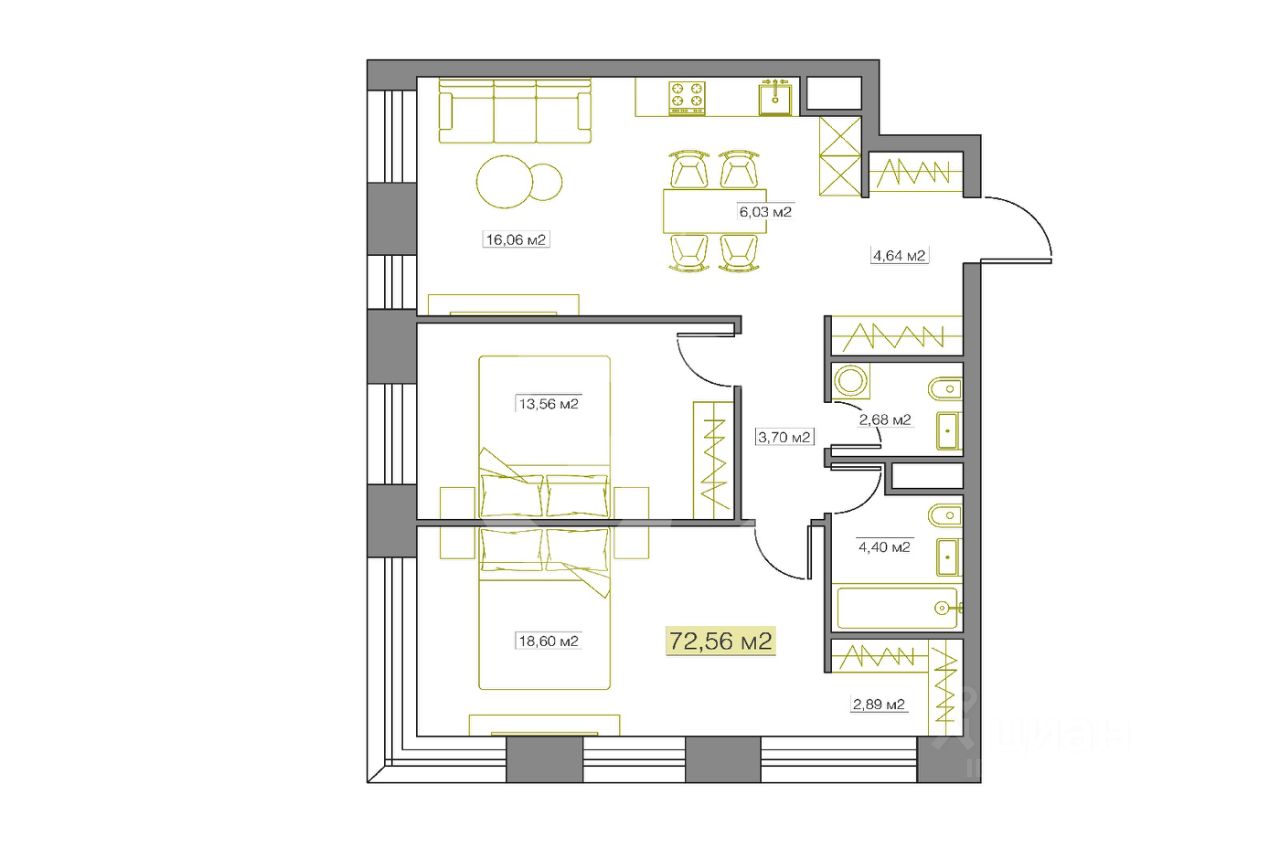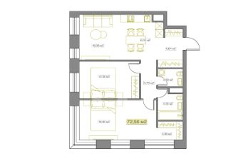 Планировка: кухня-гостиная, мастер-cпальня, обширные гардеробные, гостевая спальня, совмещенный су, холл.