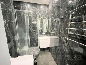 Квартира оформлена в современном дизайнерском стиле. В наличии вся необходимая мебель как на кухне, так и в комнате. Здесь есть всё, что нужно для комфортного проживания: кондиционер, холодильник, посудомоечная машина, телевизор и стиральная машина. Ванная комната оснащена душевой кабиной.