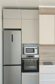 Оснащена вместительными шкафами и кухонным гарнитуром, а также необходимой техникой: кондиционеры, холодильник, посудомоечная и стиральная машины, микроволновая печь, варочная панель, духовой шкаф, датчики защиты от протечек.