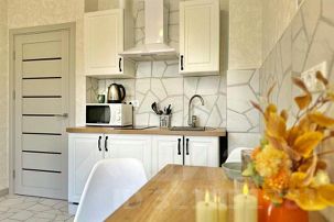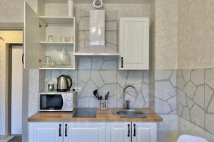 Кухня-гостиная оборудована всей необходимой посудой и техникой для готовки ваших любимых блюд.