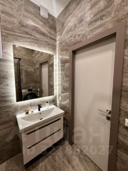 Ванная комната оборудована душевой кабиной, большим зеркалом с подсветкой, тумбой для хранения с раковиной и совмещена с санузлом