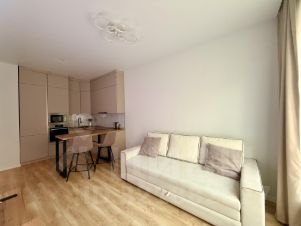 Квартира с евроремонтом, полностью готова к проживанию. Две комнаты, в т.ч изолированная спальня с двуспальной кроватью и ортопедическим матрасом. В гостиной вместительный раскладной диван-кровать. В комнатах и на кухне есть вся необходимая мебель и техника. Из техники в вашем распоряжении: кондиционер, холодильник, посудомоечная машина, телевизор и стиральная машина, микроволновая печь, духовой шкаф, электроплита, чайник, вытяжка, вертикальный безпроводной пылесос, утюг.