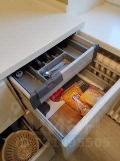 Полностью оборудованная кухня — плита, микроволновка, посудомоечная машина, встроенный фильтр воды, холодильник, чайник, посуда и кухонные принадлежности.