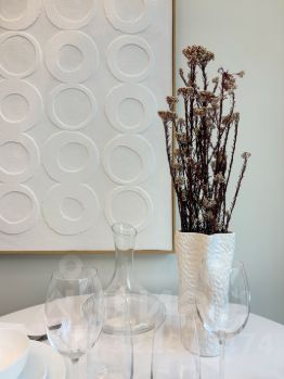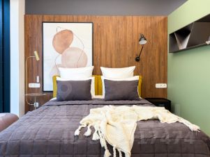 Спальная зона: оснащена двуспальный кровать, обеденный стол с двумя стульями, тумбой и пуфиком.