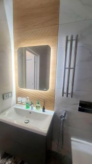 Квартира имеет удобную планировку : Большая кухня -гостиная площадью 25кв.м ,просторная прихожая и отдельная спальня площадью 17кв.м. В ванной комнате у нас установлена и ванна и душевая кабина.