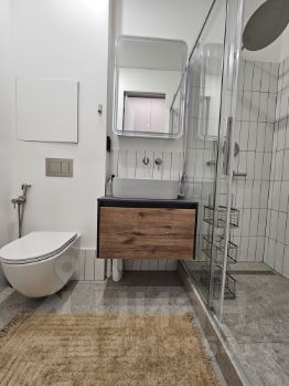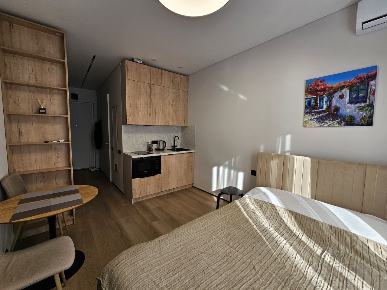 Весь набор удобств для комфортного проживания: двухспальная кровать с ортопедическим матрасом и с комплектами постельного белья на две персоны, интернет (вай-фай и цифровое телевидение), телевизор Smart TV, кондиционер (сплит-система), мини-кухня (встроенные варочная панель, вытяжка, СВЧ-печь, посудомоечная машина и большой двухкамерный холодильник), встроенный фильтр для питьевой воды, электрочайник, кофемашина, полный набор посуды и столовых приборов, постельное бельё, косметика (шампунь, гель для душа, мыло, крем), полотенца, утюг, фен, отпариватель, гладильная доска, встроенные шкафы для хранения одежды, в ванной комнате - стиральная машина, большая душевая кабина, гигиенический душ.