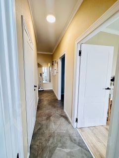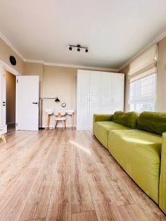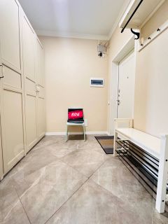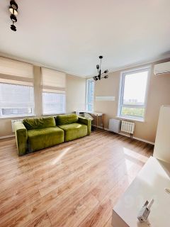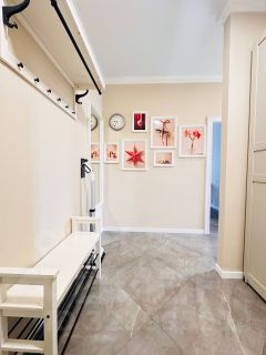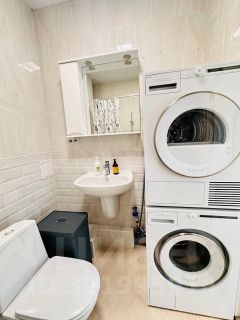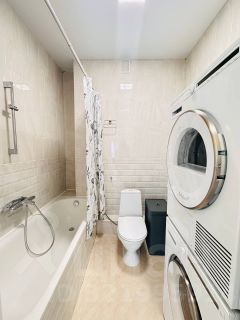 Квартира полностью готова для комфортного проживания. В ней есть современная мебель на кухне и в комнате, а также вся необходимая техника: кондиционер, холодильник, посудомоечная , стиральная и сушильная машины. В каждой комнате стоит воздухоочиститель. В ванной комнате установлена ванна, что делает её особенно уютной. Также имеется балкон для отдыха на свежем воздухе.