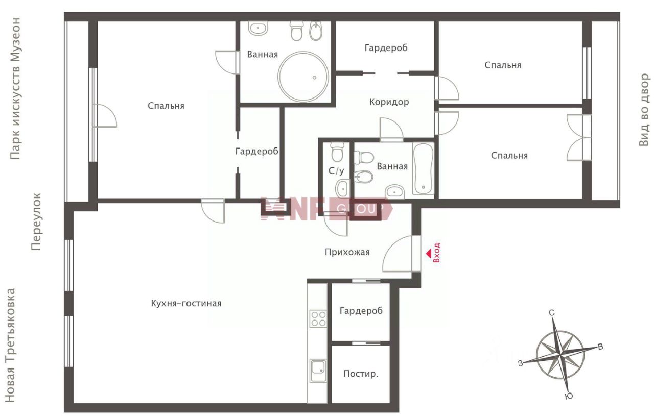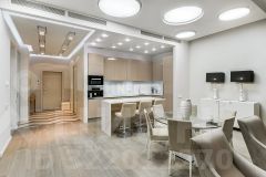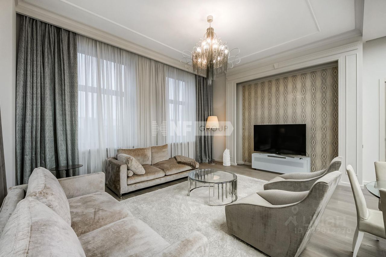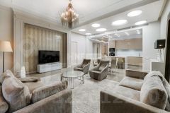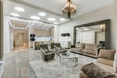 Планировка включает гостиную-студию с панорамным видом, три спальни, три санузла. Квартира укомплектована мебелью импортного производства и изготовленной на заказ.