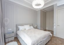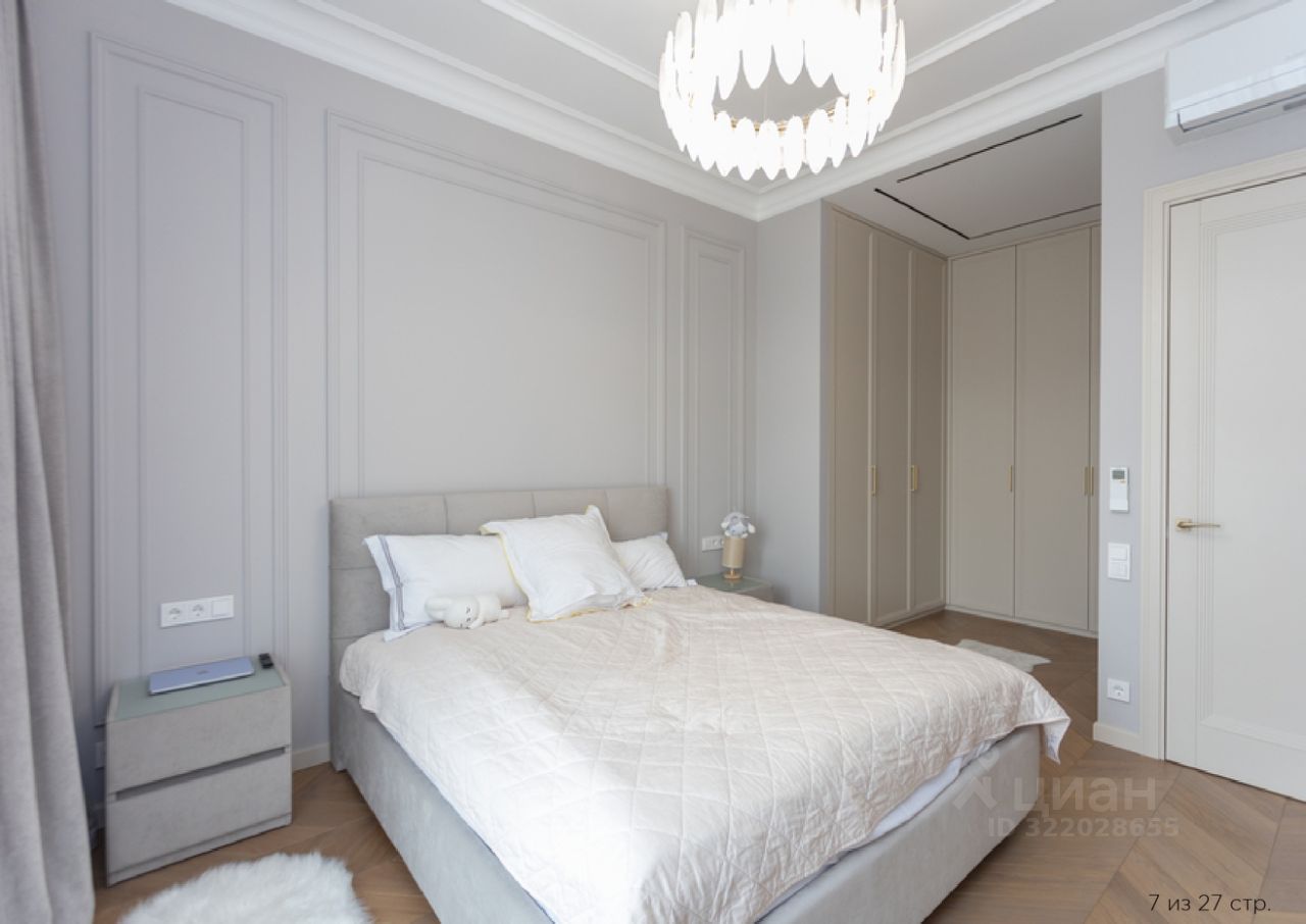 Интерьеры выполнены в светлой палитре с использованием премиальных материалов: мрамор, натуральное дерево, итальянская кухня. Пространство наполнено светом благодаря панорамному остеклению. Планировка включает просторную гостиную с балконом, приватную спальню с балконом, гардеробной и санузел с душевой зоной.
