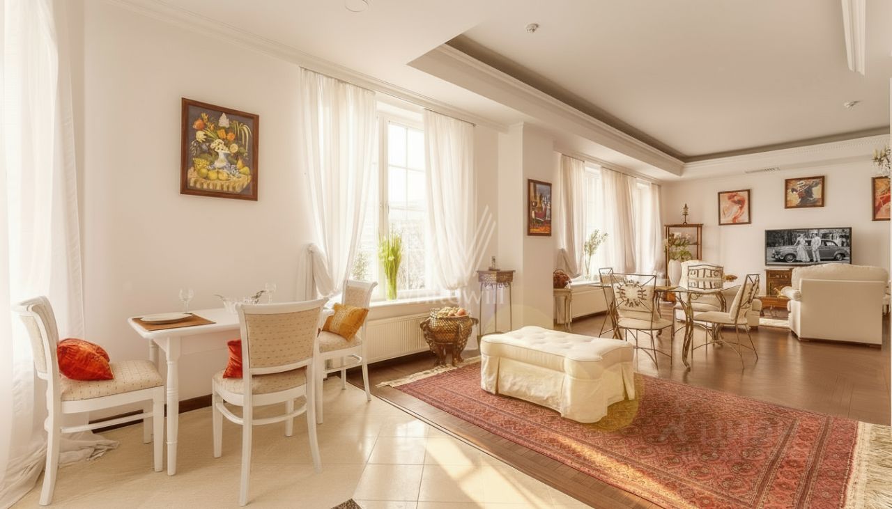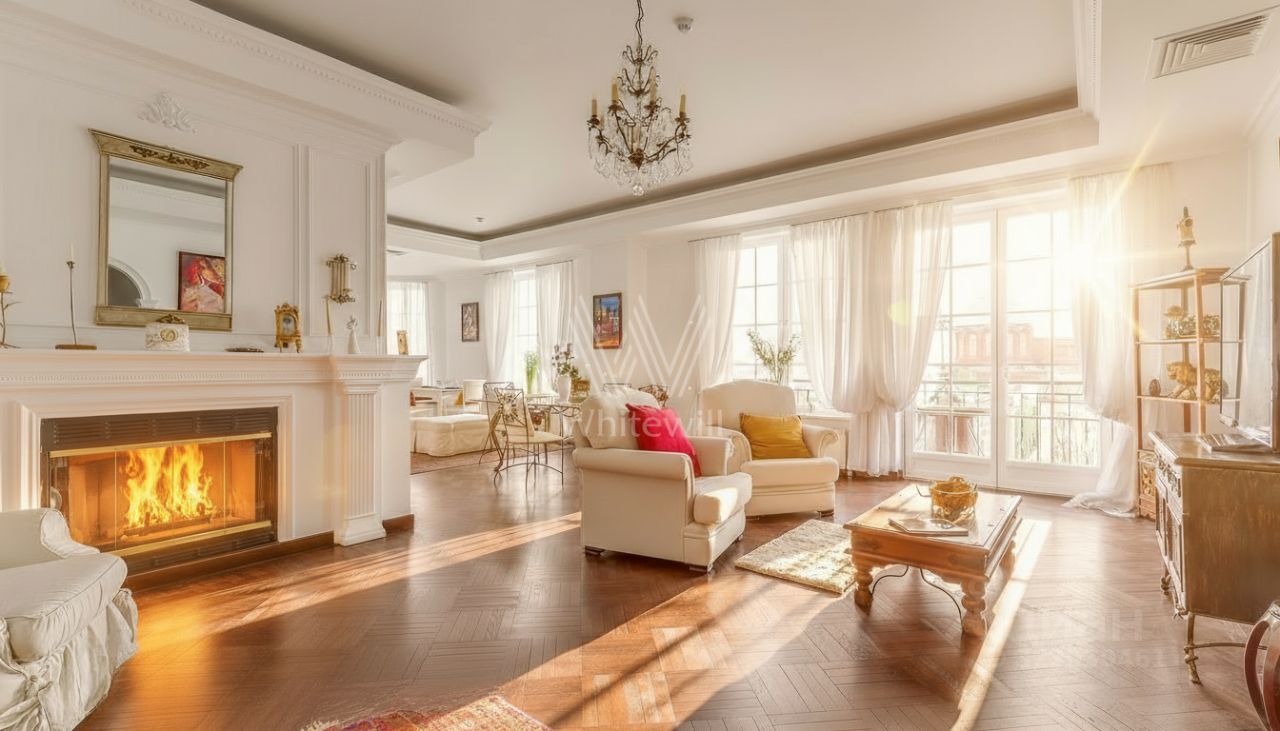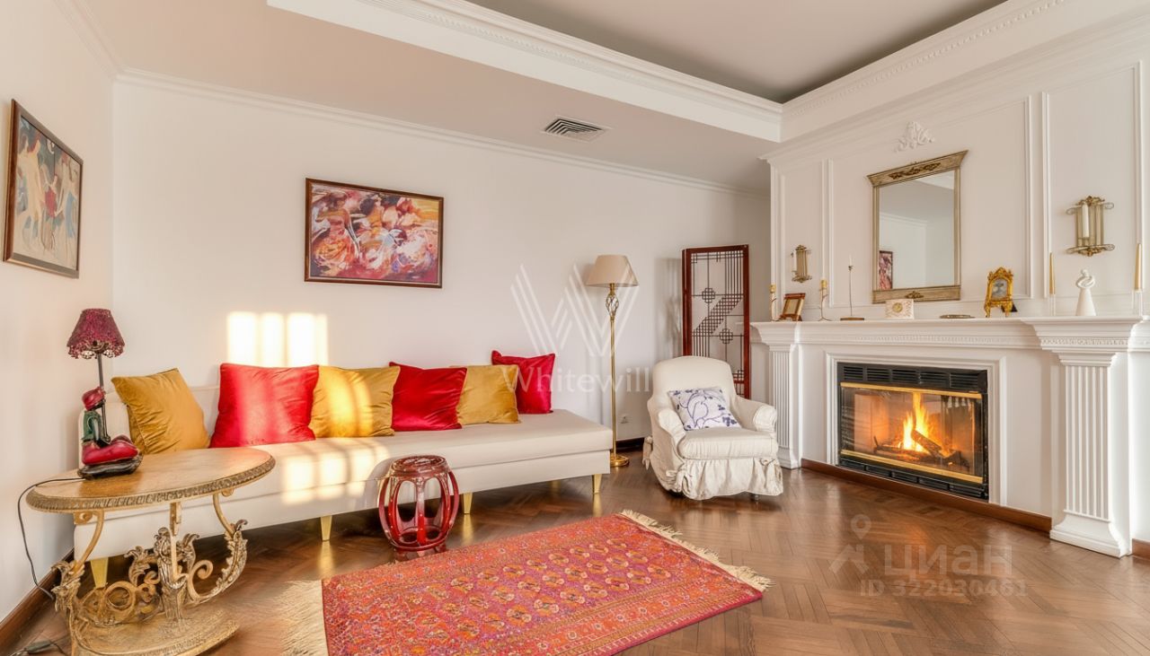 Видовая квартира с камином и 2-мя спальнями общей площадью 150 м² в клубном комплексе "Агаларов Хаус". Выполнена светлая дизайнерская отделка в классическом стиле. Интерьер украшен картинами и подвесными люстрами. Распашные панорамные окна, потолки высотой 3,2 метра.