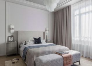 Интерьер выполнен в классическом стиле в светлых тонах с использованием натуральных материалов — дерева, паркета и тактильных текстур.