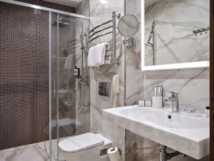 Номер оснащен банными халатами, чайным набором, тапочками, минеральной водой. В ванной комнате ванна, туалет, гигиенические принадлежности.