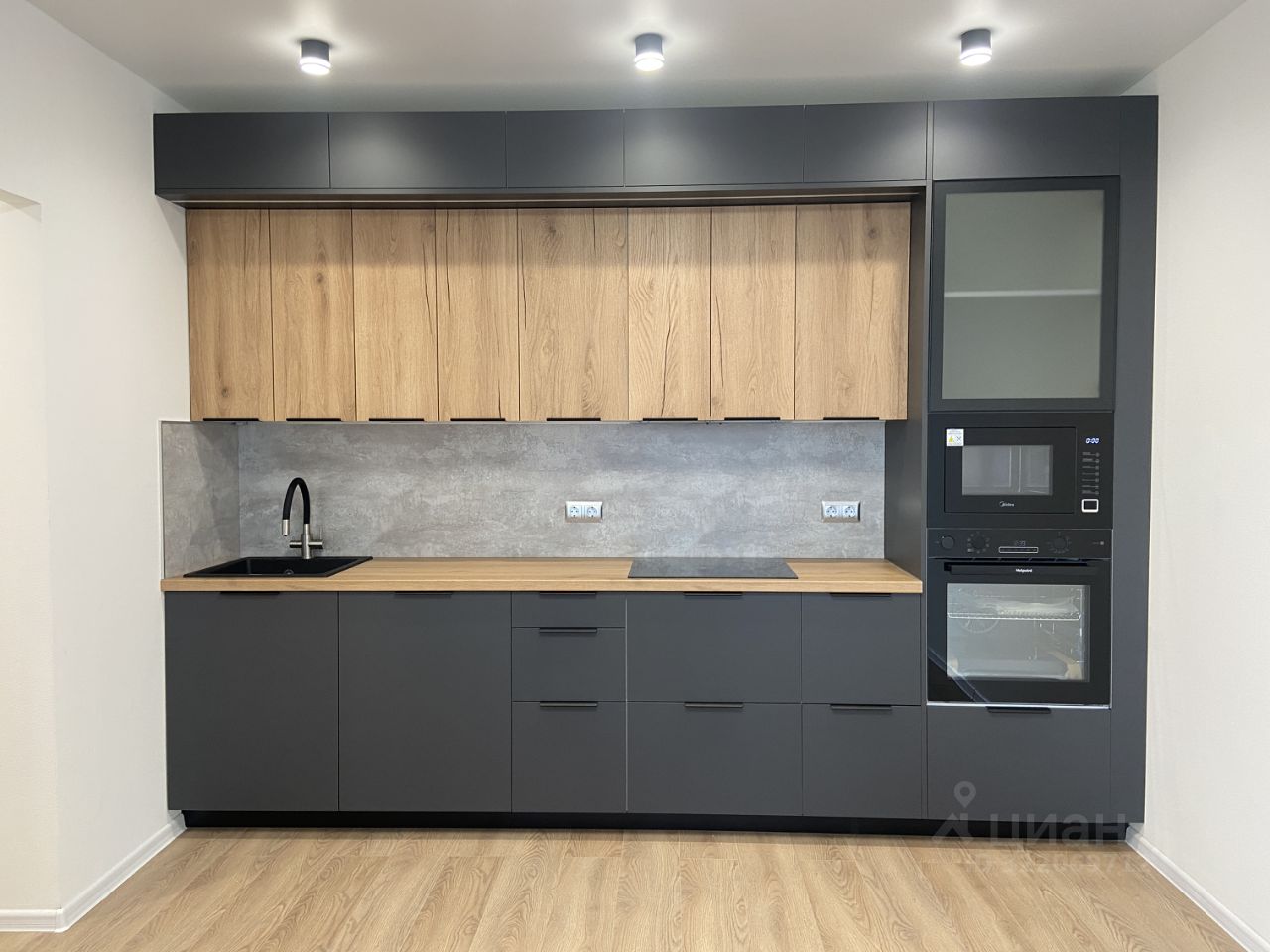 Кухня и гостинная объединены в единое пространство (20,8 кв.м ). В кухонном гарнитуре есть вся необходимая бытовая техника: стеклокерамическая варочная поверхность, вытяжка, полноразмерная посудомоечная машина, шкаф с сушкой для посуды, духовой шкаф, микроволновая печь, двухкамерный холодильник. В квартире две изолированные комнаты 9,3 и 10,5 кв.м.