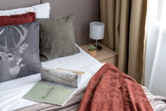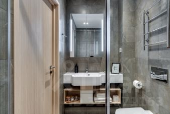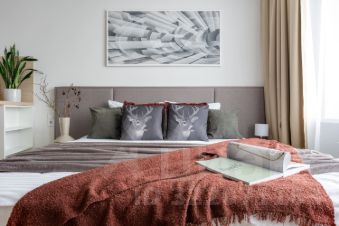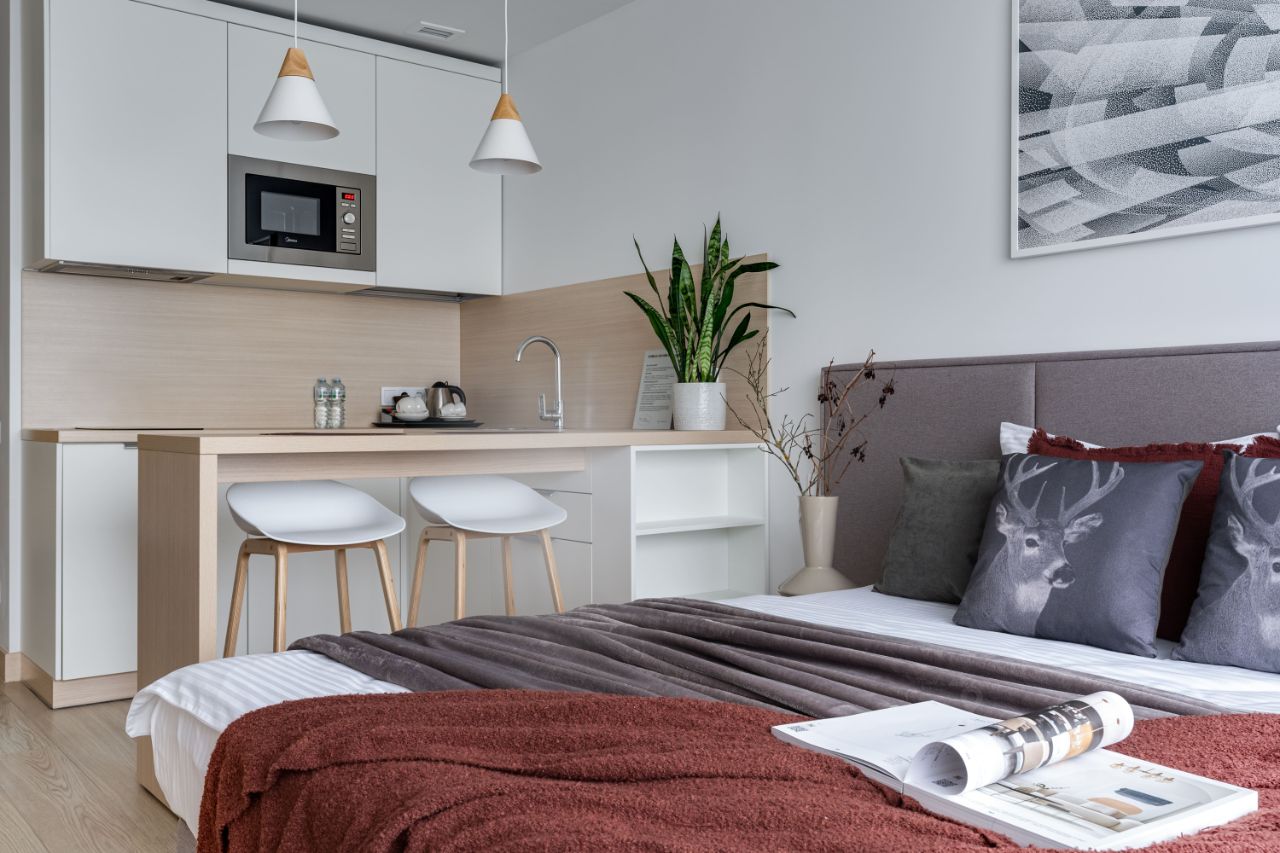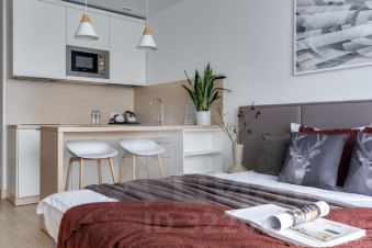 В апартаменте есть все для комфортного проживания. В зоне спальни расположена кровать 180*200 или 2 односпальные кровати 90*200 c ортопедическими матрацами, прикроватные тумбочки и лампы. В рабочей зоне есть письменный стол, лампа, кресло. Кухонная зона полностью оборудована бытовой техникой и посудой. Есть индукционная варочная плита, вытяжка, холодильник, стиральная машина, микроволновая печь, чайник. Кастрюли, сковорода, столовые приборы, чашки, тарелки и др. Санузел совмещенный,