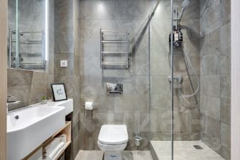 с душевой кабиной. Есть утюг, гладильная доска и сушилка для белья.