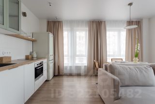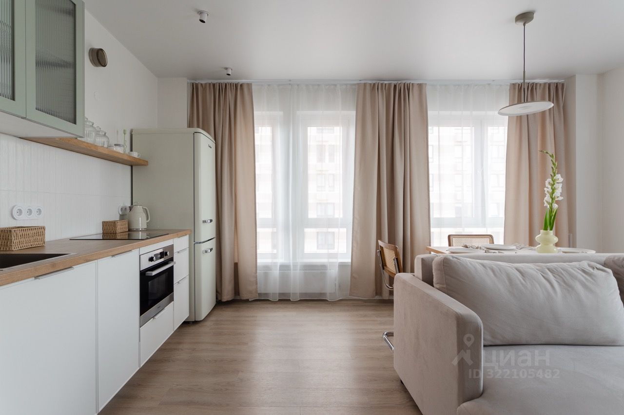* Кухня-гостиная с тремя окнами на две стороны и панорамным видом. Техника: индукционная варочная панель, духовка с функцией СВЧ, посудомоечная машина, фильтр очистки воды, холодильник, чайник.