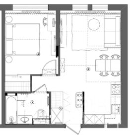 Общая площадь квартиры составляет 46 кв. м, из них 27 кв. м жилая площадь и 10 кв. м просторная кухня.