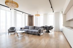 При отделке квартиры использовались дорогие материалы: паркетная доска из тонированного дуба для пола, плитка Терраццо для ванных комнатах, кухонный комплект выполнен компанией Molteni Group.