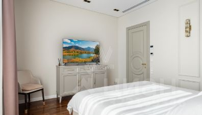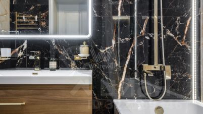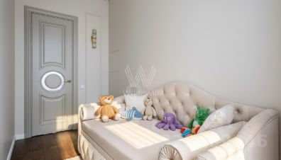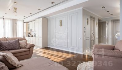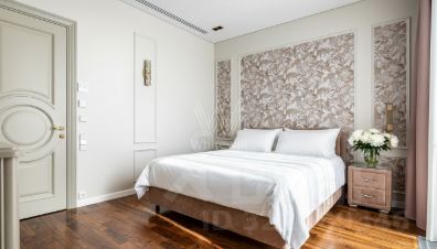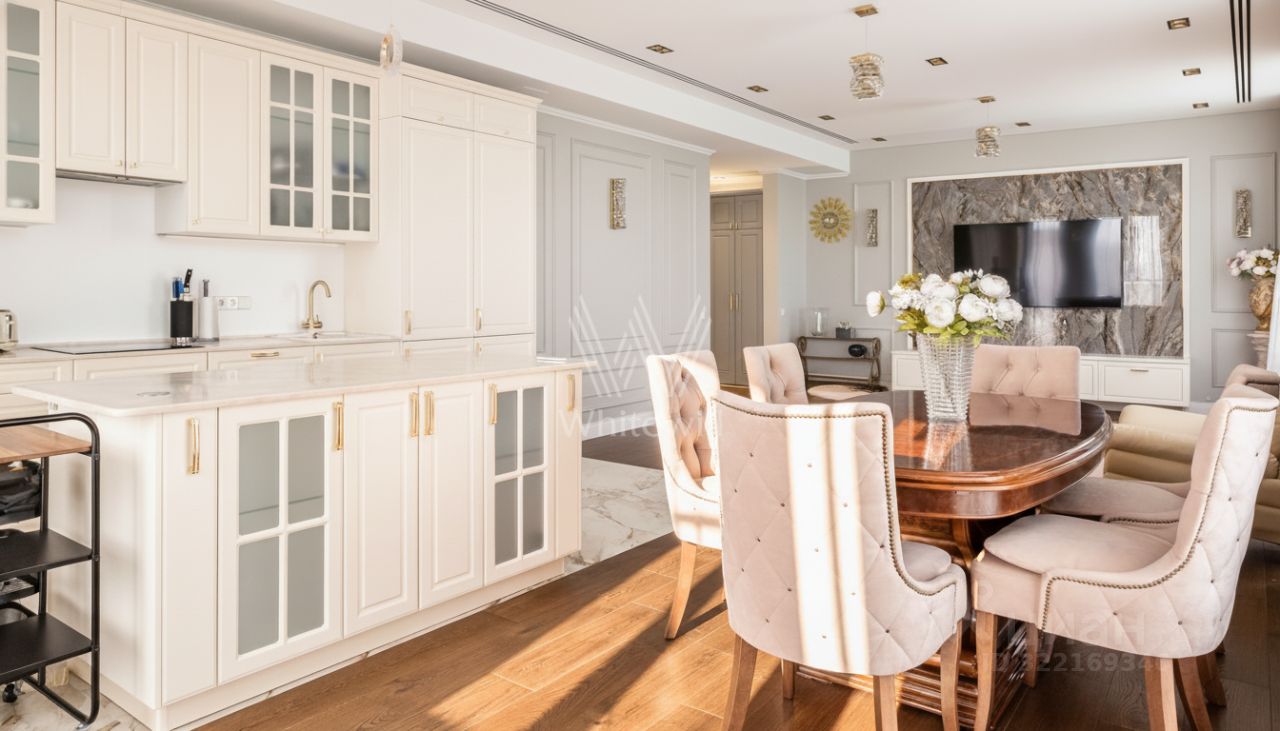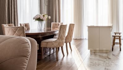 Эта квартира ощущается как прикосновение шёлка к коже. Свет струится сквозь высокие окна с французскими балконами и мягко ложится на поверхности. Неоклассический интерьер говорит шёпотом, успокаивая. В воздухе — аромат капучино и свежей выпечки.