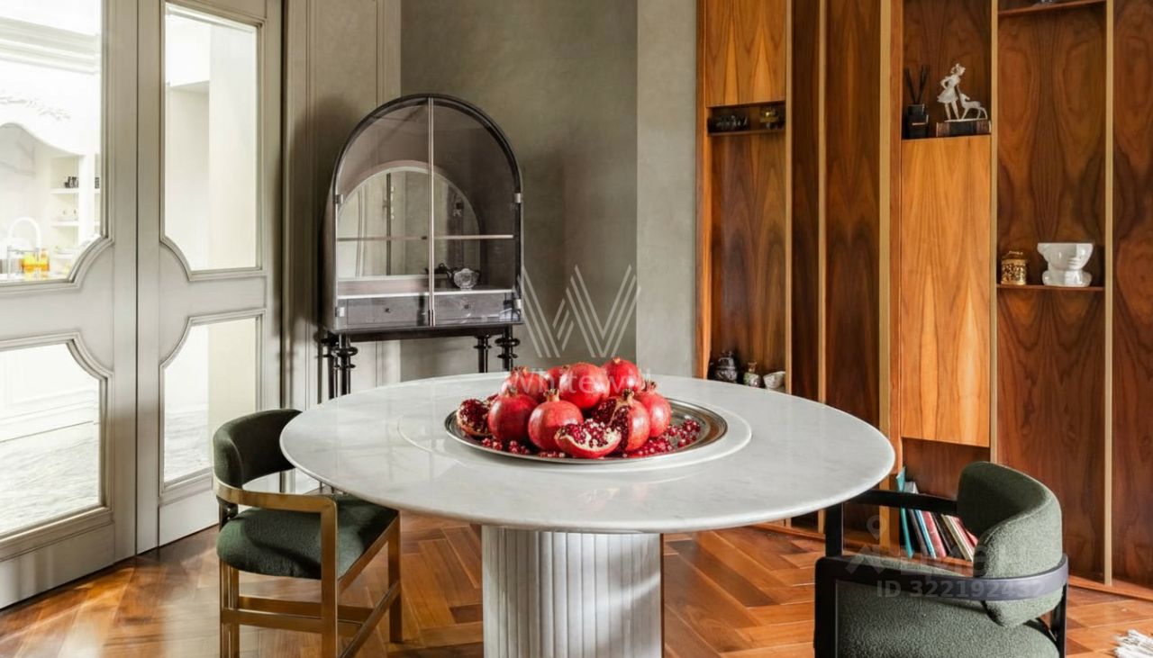 Эта квартира хранит то же интеллигентное спокойствие с ноткой избранности. За окнами свет касается университетского шпиля. Мрамор, оникс и кварцит играют фактурами и оттенками в первых лучах. А вы начинаете утро с авокадо-тостов и свежевыжатого сока в кругу семьи, прежде чем все начнут собираться на работу, спорт или учёбу.