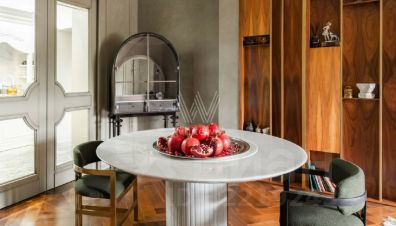 Гостиная — образец богемного вкуса. Натуральный камень, лепные карнизы и молдинги, латунные светильники и распашные двери задают торжественный тон. Дерево тёплого орехового оттенка, зелёная обивка кресел, бордовые шторы и ковёр в стиле бохо добавляют артистизма. Здесь вы собираете гостей за большим мраморным столом, чтобы сыграть в "Мафию" — игру, придуманную по соседству, в университете.