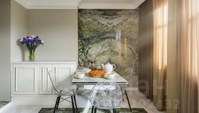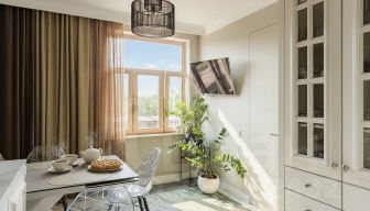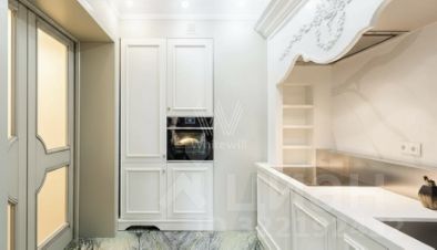 Раскрываете двери — и оказываетесь на кухне. Белые филёнчатые фасады и сияние зелёного камня готовят к гастрономическим экспериментам. Здесь запекают лосось со спаржей и готовят шоколадный фондан — и подают в уютной столовой.