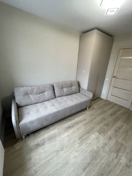 В маленькой комнате, кроме вместительного шкафа, есть отличный ортопедический диван евро книжка с независимым прижинным блоком, максимально комфортный как для посадки так и для сна.
