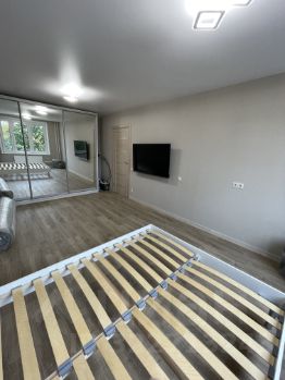 В большой комнате, помимо огромного шкафа длиной 270 см., есть двухспальная кровать с ортопедическим матрасом фирмы Орматек с блоком независимых пружин, для максимально комфортного отдыха . Плюс шикарный 55 дюймовый 4К телевизор.