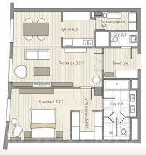 Планировка апартамента включает в себя: просторную кухню-гостиную, спальню,гардеробную зону и в целом большое количество мест для хранения, отдельную построчную,а так же два санузла.