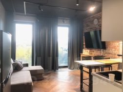 Сдается современная и очень уютная Студия - апартаменты с высокими потолками с только что выполненным дизайнерским ремонтом. (Никто не жил, вся мебель и бытовая техника новые). Кондиционер, теплый пол. Полноценная кухня с варочной поверхностью, духовым шкафом, посудомоечной машиной, встроенной микроволновой печью и холодильником.
