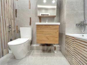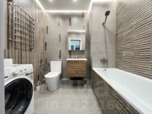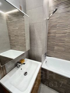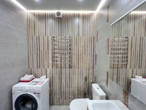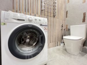 Большой совместный с/у со стиральной машиной Hot Point Ariston, полноценной ванной, подвесной потолок с подсветкой, гигиенический душ, система против протечки воды.
