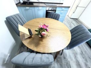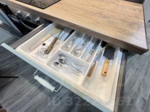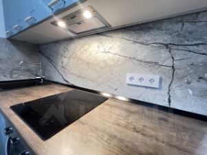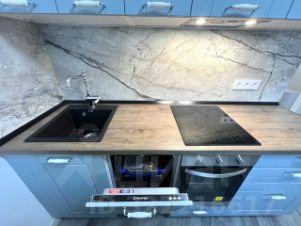На кухне: встроенный гарнитур с техникой (варочная панель и духовка ORE, посудомоечная машинка MAUNFELD, вытяжка, холодильник Hot Point Ariston, комплект посуды, новые столовые приборы), обеденный стол, 4 мягких стула, диван раздвижной, телевизор. Выход на сдвоенный застекленный балкон.