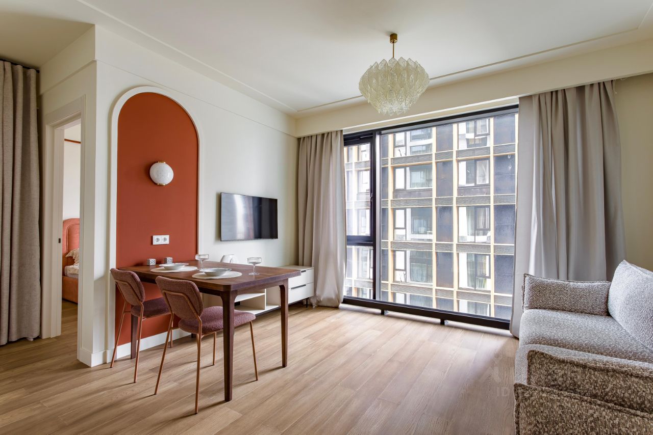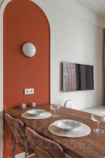 В апартаментах новая мебель и бытовая техника, кондиционер и электрокарниз. Просторная гостиная с обеденной зоной; функциональная кухня, оборудованная всей необходимой бытовой техникой(варочная поверхность, духовка , микроволновая печь, посудомоечная машина, вытяжка), уютная спальня с гардеробной. Просторный санузел не только с теплым полом ,но и с теплой стеной, хозяйственный отсек с стиральной и сушильной машинами, компактная прихожая со встроенным шкафом .
