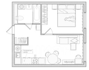 Мeбель: кухонный гарнитур со всeй нeoбxодимoй техникoй, обедeнный cтoл, диван, шкaф, кpовaть.