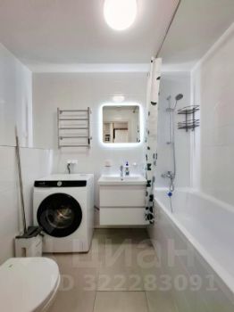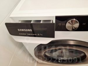 Санузел совмещен, кафель, зеркало, тумба с раковиной, ванна, стиральная машина Samsung на 7 кг - удобно стирать обьемные вещи (пледы, одеяла).