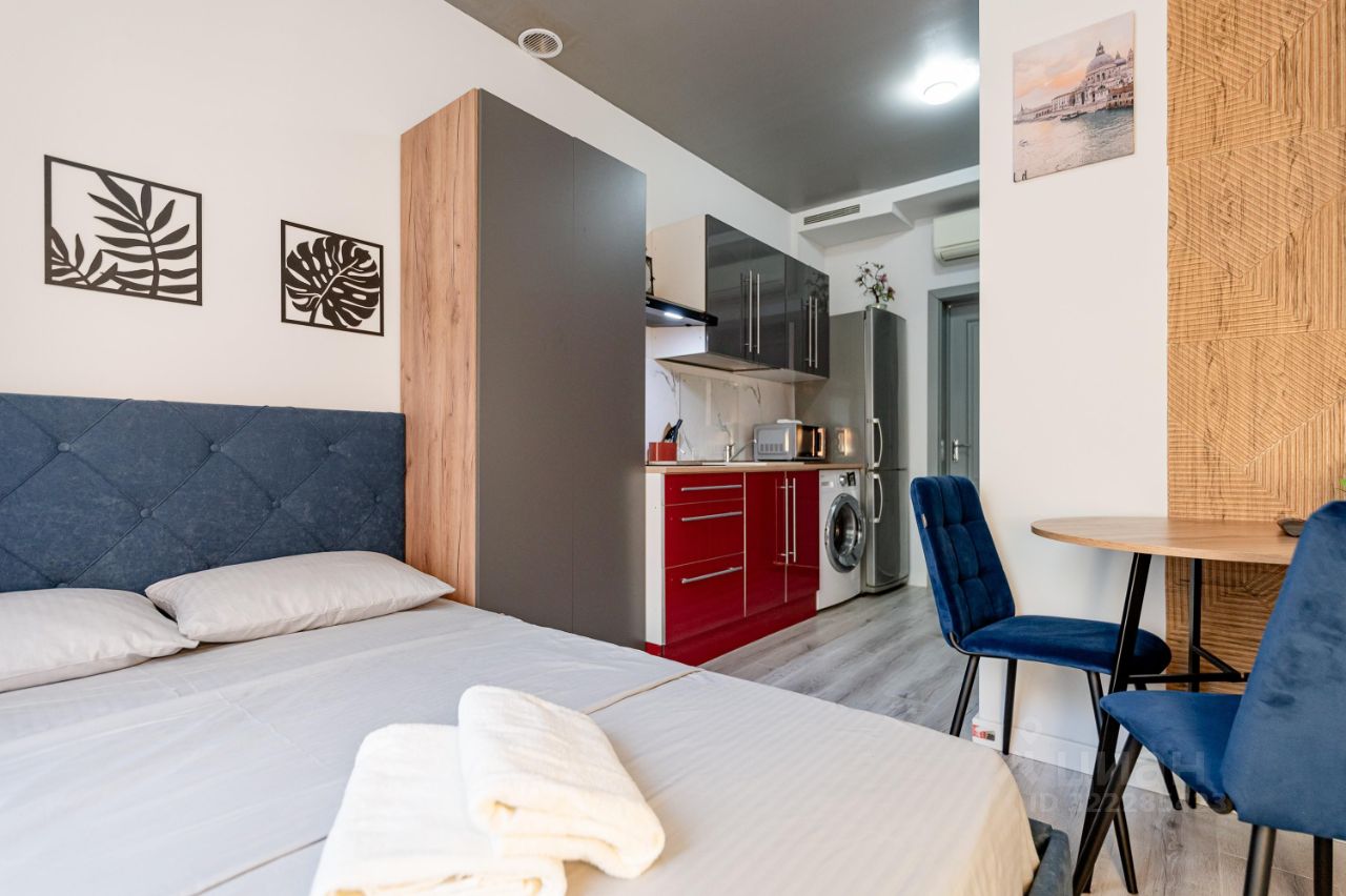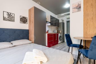 Современная мебель, двуспальная кровать, бытовая техника, скоростной WI-FI, спутниковое TV, гладильная доска, сушка, оборудованная кухня, полный комплект посуды для приготовления и приёма еды, шампунь/гель/мыло, тапочки и фен