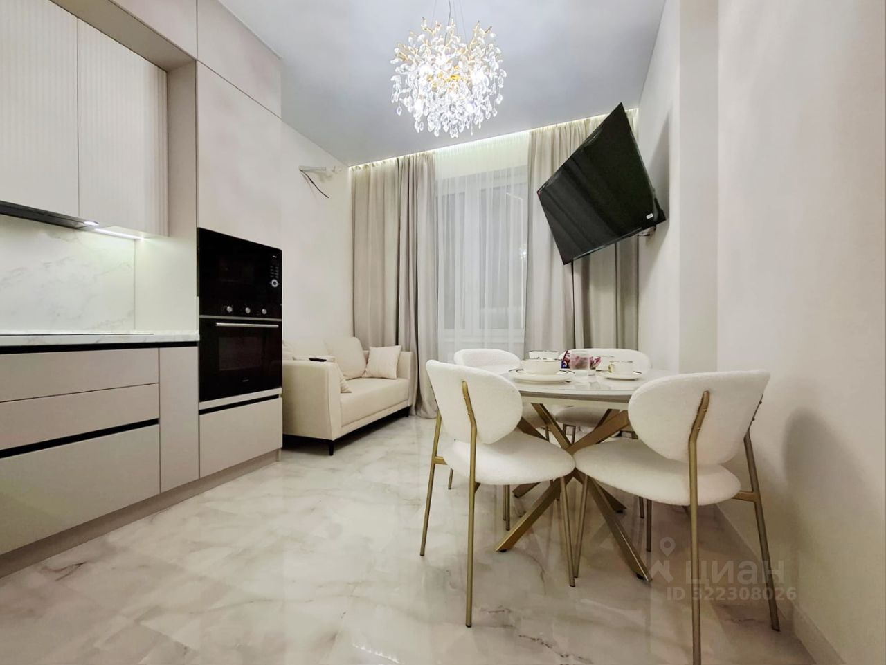 В кухне-гостиной в зоне приготовления еды - встроенный гарнитур со всей необходимой новой техникой: варочная стеклокерамическая панель, духовой шкаф, вытяжка, посудомоечная машина, 2х камерный встроенный холодильник. Большая столешница, есть где разместить своих помощников (тостер, блендер и т.д.). Достаточное количество света - основной свет, подсветка рабочей поверхности, подсветка карниза. В зоне приёма пищи находится уютная обеденная группа на 4 персоны ( стол , стулья), есть столовая посуда.