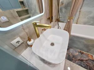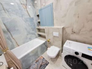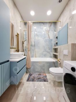 Санузел совмещен, а прекрасное сочетание естественных природных оттенков голубого, бежевого и золота - будет наполнять Ваш день гармонией.