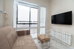 В зоне гостиной установлен уютный и удобный диван. Сидя на диване можно комфортно смотреть большой телевизор, работать в ноутбуке и любоваться великолепным видом в панорамном окне - вид завораживающий , особенно закат! Можно включить уютные филоментыйе бра над диваном .Имеется мягкий пуф для ног.