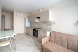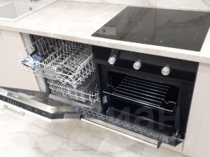 В кухне-гостиной установлен удобный кухонный гарнитур с полным набором техники : ПОЛНОЦЕННАЯ широкая посудомоечная машина БОШ, плита, духовой шкаф, мощная вытяжка-слайдер, вместительный холодильник. . Кухонный гарнитур также имеет светодиодную подсветку. Установлен современный качественный кондиционер. Обеденный стол при желании можно раздвинуть еще шире.