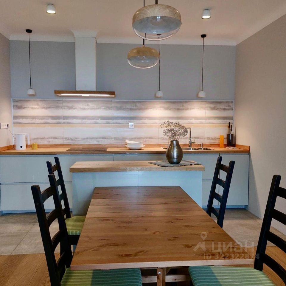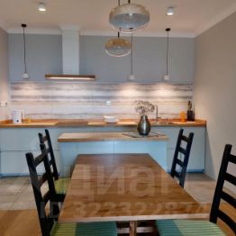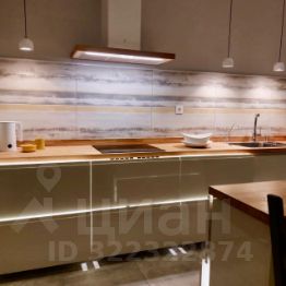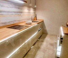 • кремово-глянцевая кухня с подстветкой в выдвижных шкафах, с островом и без верхних шкафов с уникальной деревянной столешницей сделанной под заказ и индукционной плитой, духовской, микроволновкой, вытяжкой, раковиной с двумя чашами и измельчителем
