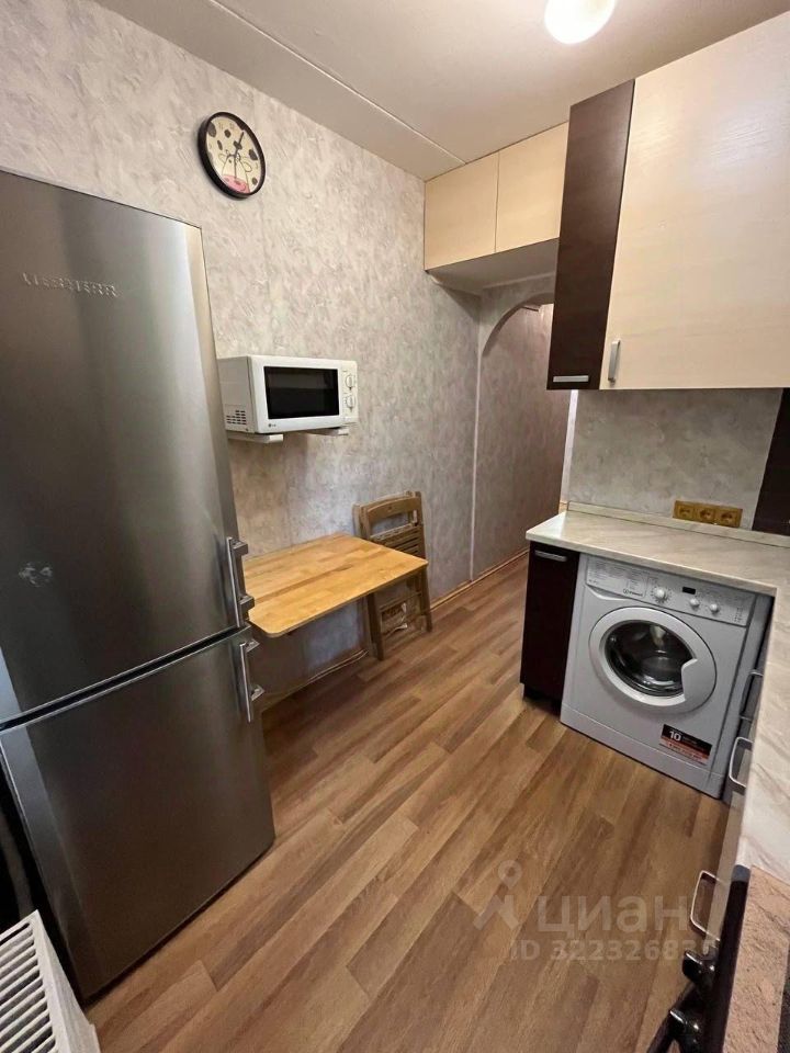 Кухня гарнитур, из техники: плита, холодильник, микроволновка, кофемашина. На кухне установлена стиральная машина. В комнатах два больших встроенных шкафа, три антресоли. В большой комнате угловой шкаф, колонка и комод. Санузел раздельный.