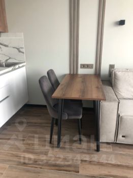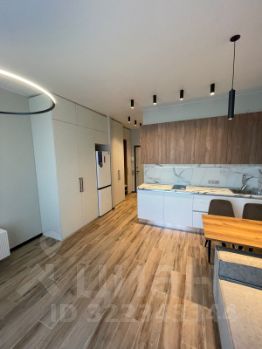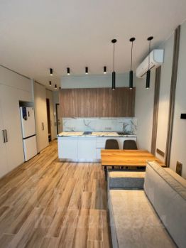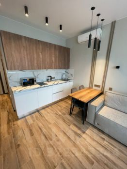 В апартаментах выполнен дизайнерский ремонт, который придаёт пространству стильный и уютный вид. В студии есть все необходимое для комфортного проживания: кондиционер, холодильник, посудомоечная и стиральная машины. Уютная кухня с мебелью позволит вам наслаждаться приготовлением пищи. В совмещенном санузле установлена душевая кабина, а окна выходят на улицу, обеспечивая помещение естественным светом.