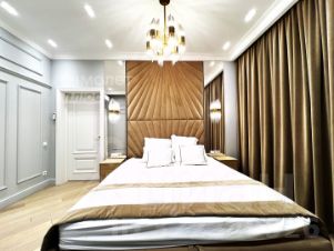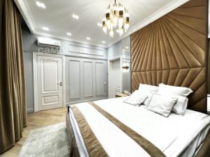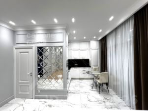 В квартире высокие потолки, функциональная планировка. Просторная Кухня- гостиная с выходом на утеплённую лоджию, вся бытовая техника NEFF и Villeroy BOCH. Изолированная спальня с выходом на утепленную лоджию. В спальне имеется большая гардеробная комната с окном. Большой санузел с ванной и душевой кабиной, в прихожей есть гостевой санузел. В комнатах на полу паркетная доска, в прихожей и на кухне мраморная плитка, все полы с подогревом, везде установлены кондиционеры. В гостиной есть биокамин. Квартира полностью меблирована, сделанной по заказу мебелью и всей бытовой техникой. Установлена шумоизоляция.