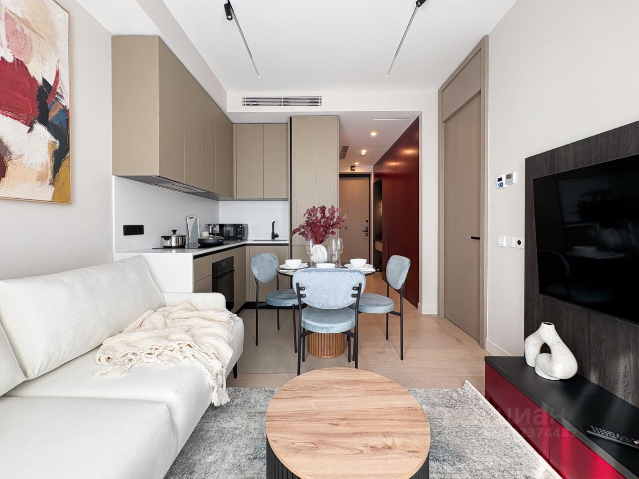 - кухонная зона оборудована необходимой бытовой техникой: варочная панель, духовая печь, свч, посудомоечная машина, вытяжка, сушилка для посуды. Обеденный стол сервирован на 3 персоны, что позволит принимать трапезы с гостями;