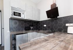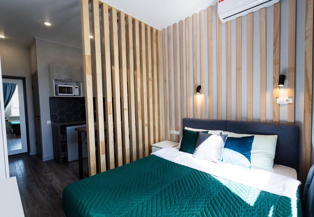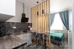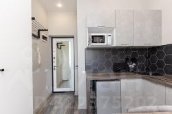 Видовая студия. В квартире сделан качественный евроремонт, что добавляет уюта и комфорта. Апартаменты полностью меблированы: есть мебель как на кухне, так и в жилой зоне. В наличии вся необходимая техника: кондиционер, холодильник, телевизор и стиральная машина. Ванная комната оборудована душевой кабиной. Благодаря этому вы можете сразу въехать и начать жить без дополнительных забот.
