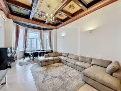 ID 31655: Предлагаются в аренду 6-ти комнатная просторная квартира в классическом стиле в престижном зеленом районе в историческом районе Москвы. Дом с круглосуточной охраной недалеко от метро Арбатская, всего в нескольких минутах ходьбы от Тверской улицы и Кремля. Функциональная планировка: гостиная, кухня, 5 спален, постирочная, 2 ванные комнаты и гостевой санузел. Квартира предлагается с мебелью. Бытовая техника: кондиционеры по всех помещениях, стиральная и посудомоечная машины, две плиты, две духовки, два холодильника, СВЧ, бойлеры. Парковка во дворе дома.